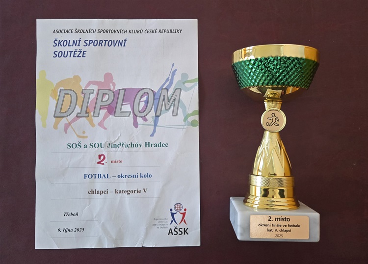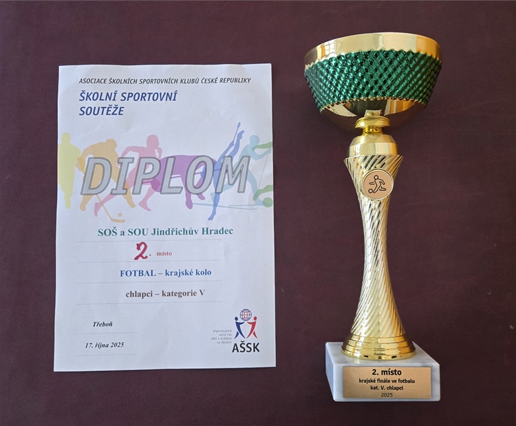 - FOTBAL okresní kolo se uskutečnilo 9.10.2025 v Třeboni. Družstvo chlapců za SOŠ a SOU JH pod vedením Rostislava Škardy (4.A, SOŠ) obsadilo celkové 2.místo, ze kterého si zajistilo účast v KRAJSKÉM kole.